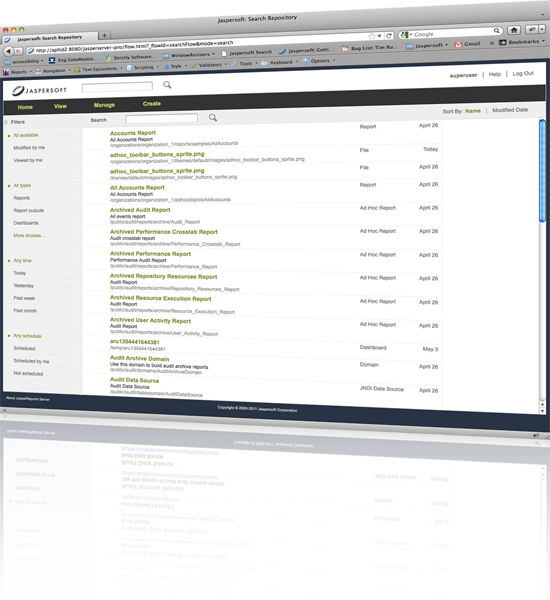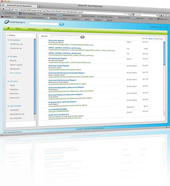 I dramatically improved the Jaspersoft user experience by adding search functionality and by introducing an engaging and consistent visual design.