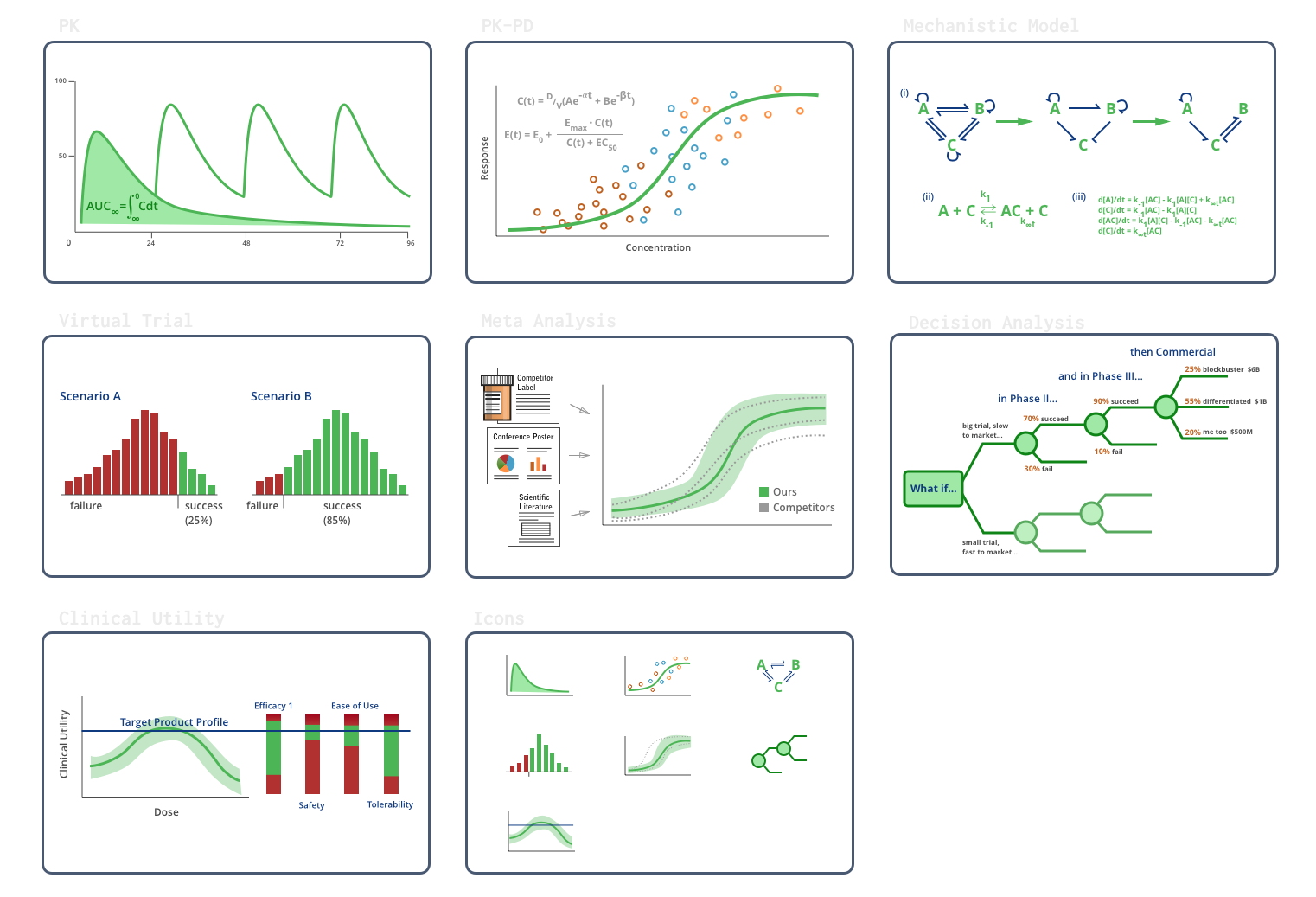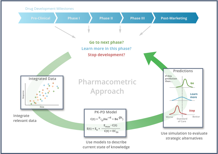 This illustration explains how an analytic method called pharmacometrics is used to inform drug development decisions.